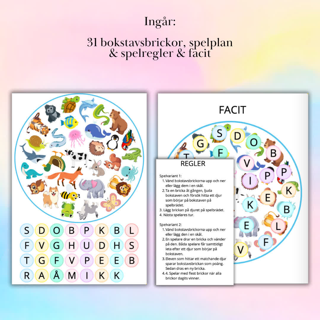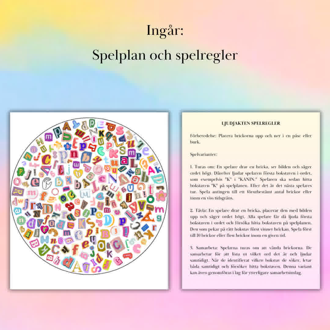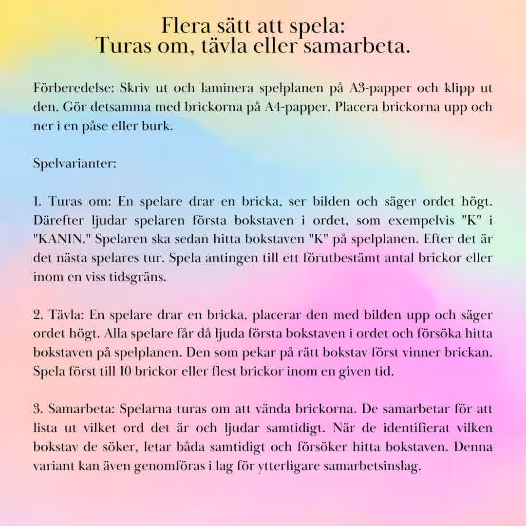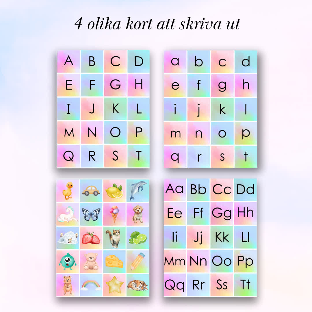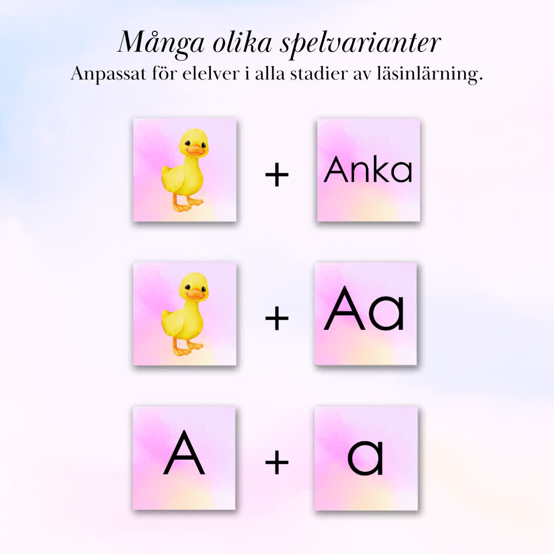 Utforska läsinlärningens värld med vårt Alfabetsmemory – ett vackert designat och lärorikt spel för unga läsare. Inspirerat av vattenfärgs-estetiken, erbjuder spelet fyra varianter där spelaren matchar bilder med ord, bokstäver, små och stora bokstäver. En pedagogisk resa in i alfabetets magi, perfekt för hemmet eller klassrummet.  Spelvarianter:  Bild + Ord: Bygger upp ordförråd genom att matcha bilder med motsvarande ord. Bild + Bokstav: Interaktiv inlärning av bokstäver, stärker alfabetets grunder och ger träning på ljudning på ett roligt sätt. Liten Bokstav + Stor Bokstav: Utvecklar bokstavskännedom genom att matcha små och stora bokstäver. Egen Matchningsvariant: Skapa unika matchningar baserat på behov eller introducera egna läsinlärningselement. Produktfunktioner:  Fyra Olika Korttyper: Varierade korttyper för stimulerande spelupplevelser. Lärorikt och Roligt: Främjar läs- och skrivfärdigheter genom rolig interaktivitet och pedagogisk design. Alfabetsmemory – mer än ett spel, en nyckel till läsinlärningens magi.