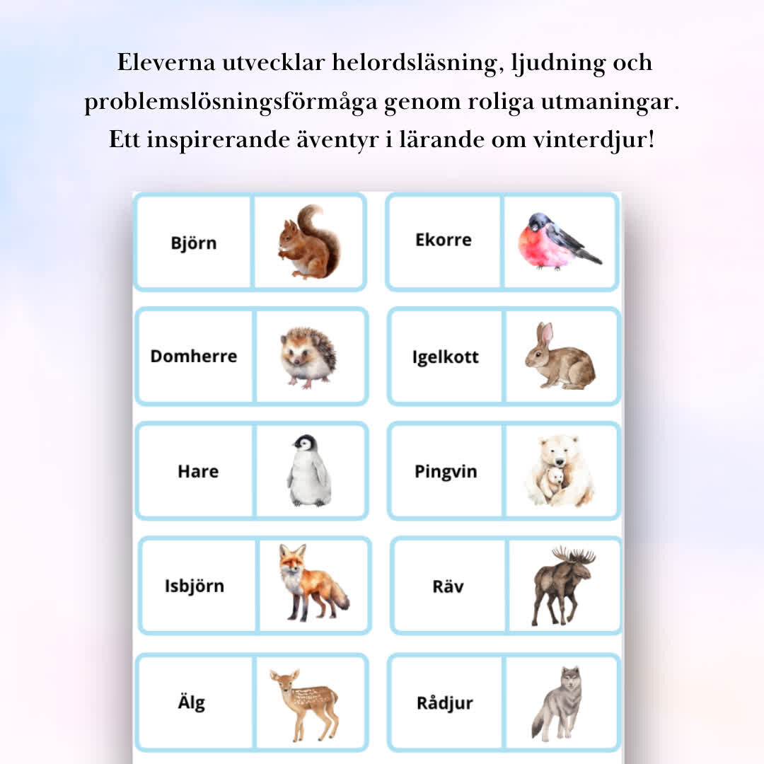 Upptäck den magiska världen av vinterdjur genom vårt interaktiva och pedagogiska spel, Vinterdjursdomino! Eleverna tar sig an spännande utmaningar där de tränar helordsläsning och ljudning samtidigt som de utvecklar sin problemslösningsförmåga. Genom en mix av roliga aktiviteter och lärorika moment blir varje spelomgång en inspirerande inlärningsresa. Låt lärandet om vinterdjur bli till ett äventyr för alla elever!