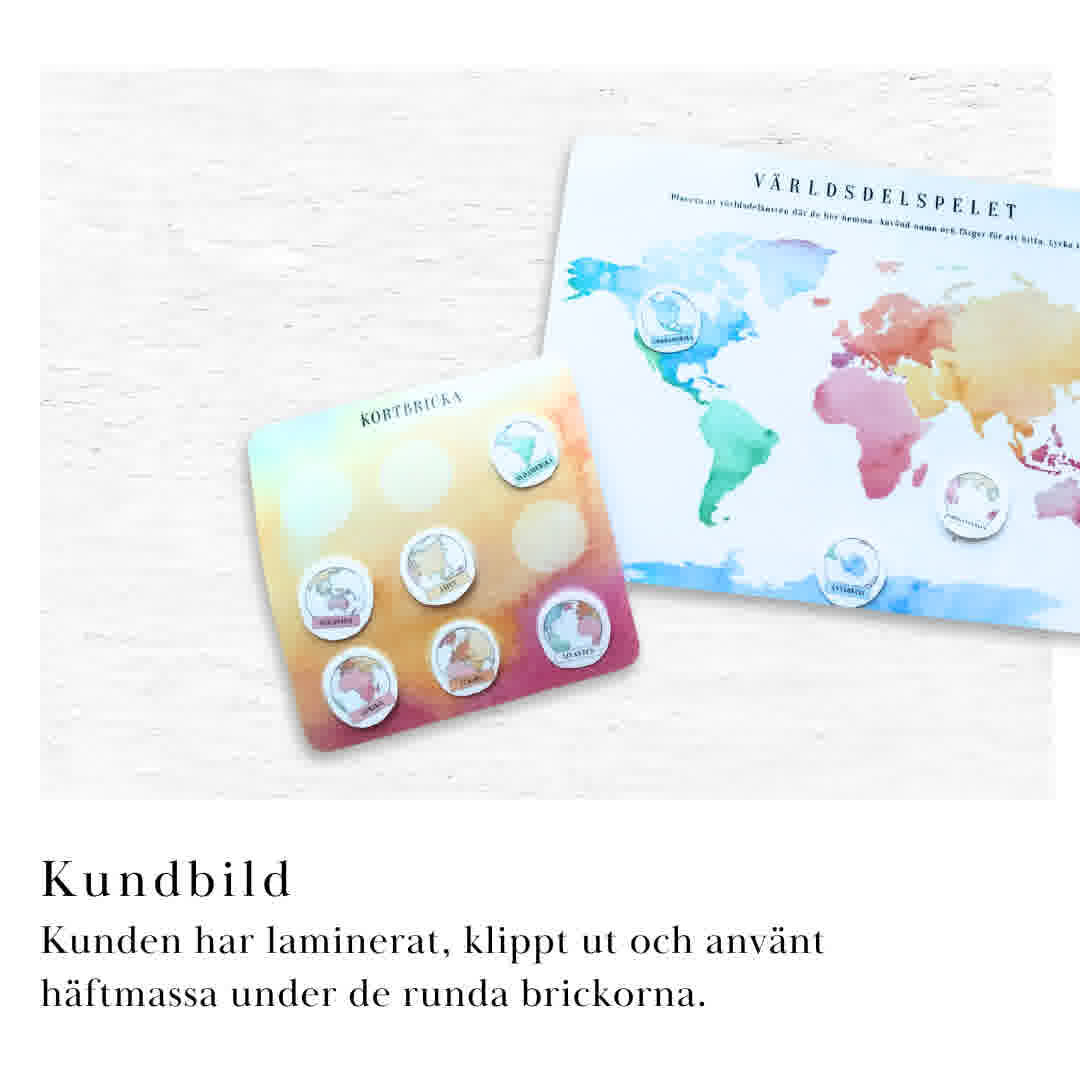 Kreativt, roligt och framförallt lärorikt geografispel om världsdelar och hav. Barnen lär sig att på egen hand hitta rätt plats på kartan genom att använda bildstödet och färgerna på kartan.  Förberedelser: Du laminerar spelplan, kortbricka och kort, klipper ut korten och använder kardborreband eller häftmassa för att fästa korten på kortbrickan. Kortbrickan är till för enklare förvaring, korten sitter där så att de inte försvinner.  Spelvarianter:  Spelet går att spela enskilt, i grupp eller i lag. När barnen spelar flyttar de helt enkelt över kortet till rätt plats på spelplanen. Du kan låta eleverna placera ut korten i ordning av världsdelens (och havens) första bokstav, storlek, färg (utefter regnbågen tex) eller valfritt. Det går även att placera korten nedvända i en hög och låta eleverna i grupp dra upp ett kort och placera det på kartan, en efter en. Du kan också låta eleverna spela memory med korten!   Inkluderat i pdf-filen: Spelplan Kortbricka Spelkort